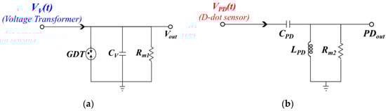 The output signals from the VT and D-dot sensor of the PRPD sensor were connected with each signal transducer, as shown in Figure 2. In a signal transducer for the VT, as the transformation ratio control capacitor and for impedance matching were installed in parallel with , the LV capacitor of the VT. The magnitude of was fixed by the insulation material and geometric parameters including thickness, length, and width. Therefore, based on Equation (1), the magnitude of should be chosen carefully to satisfy the high-accuracy measurement specified in IEC 61869-11. The output resistance, , was set to 2 megaohm (MΩ) for impedance matching with the measuring instrument. A gas discharge tube (GDT) was installed at the front of the transducer circuit to protect from unexpected surges during the experiment.