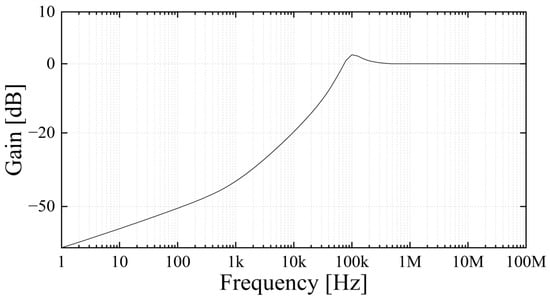 Figure 3 shows the frequency response of the signal transducer for the PD pulses. Due to the propagation characteristics of the distributed elements of a conductor, the UHF component of PD pulses is attenuated by dielectric loss (tan δ) [35,36]. Therefore, the low cut-off frequency of the transducer was set about 63 kHz (−3 decibel (dB)). The gain was set to 1 for frequencies above 200 kHz, considering the attenuation of UHF band signals caused by the distributed element.