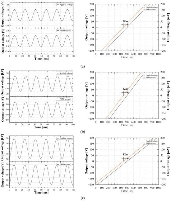 To assess the sensitivity and accuracy of the voltage measurement, 80%, 100%, and 120% of the rated voltage (13.2 kV) were applied according to the test guideline in IEC 61869-11. Figure 6 shows example waveforms and phase errors of the applied voltage and the PRPD sensor at each voltage level. The voltage waveforms were captured for six cycles to compare the average voltage levels. In addition, the phase errors were confirmed by analyzing each zero-crossing (ZC) point of the waveforms of the applied voltage and the PRPD sensor.