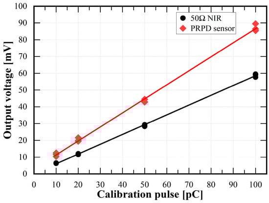 Before the PD detection experiment, a calibration test was conducted to evaluate the linearity of the prototype PRPD sensor using the PD simulator. Artificial calibration pulses of 10 pC, 20 pC, 50 pC, and 100 pC with a rising time of tens of nanoseconds were injected into the PD simulator using a calibrator (CAL 1A, Power Diagnostix Systems GmbH, Aachen, Germany). Figure 7 shows the average output voltage detected by the PRPD sensor and the conventional electrical detection method in accordance with the calibration pulses. Each output voltage of the 50 Ω NIR and PRPD sensor was recorded five times to calculate their average values. The calibration test confirmed that the output of the prototype PRPD sensor had linearity with respect to the calibration inputs and was more sensitive than the conventional method.