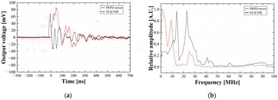 Figure 8 shows examples of the single PD pulses from a metal protrusion defect at 4 kV, measured simultaneously with the prototype PRPD sensor and the 50 Ω NIR, and the fast Fourier transform (FFT) results. The rising time, falling time, and pulse width were analyzed by calculating the average values of 10 single PD pulses. They were 47.2 ns, 52.9 ns, and 51.6 ns in the PRPD sensor and 15.8 ns, 13.3 ns, 16.3 ns in the 50 Ω NIR, respectively. The rising and falling time and pulse width of the PRPD sensor were approximately three times longer than those of 50 Ω NIR. The main frequency ranges and maximum frequency with the highest magnitude were distributed from 2 MHz to 10 MHz and 3 MHz in the PRPD sensor, and 13 MHz to 24 MHz and 14 MHz in the 50 Ω NIR, respectively. The frequency spectrums of the PRPD sensor are relatively lower than those of 50 Ω NIR. This is because as the PD pulse flows through the conductor, the UHF component is attenuated by the distributed element. In this case, the frequency ranges over 40 MHz were attenuated.