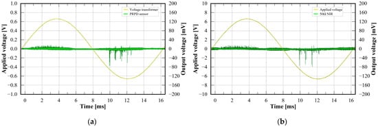 The HV Tr., IVR, HV divider, PD simulator, and measuring devices were grounded to avoid an unexpected electrical potential difference. The level of background noise was less than 3 millivolts (mV) (measured using the prototype PRPD sensor) and 2 mV (measured using a 50 Ω NIR), respectively, in the experiment. To enhance reproducibility, measurements of output accuracy and PD pulses were conducted through experiments repeated more than five times. All parameters were systematically analyzed under consistent conditions to derive reliable results.