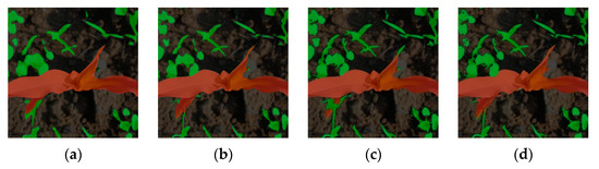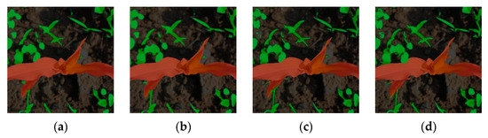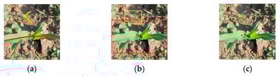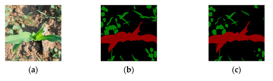 The weed label images are then obtained by superimposing the preliminary weed mask through the Exceed green feature Graying (EXG) method with the Otsu method and the difference method and then optimized by the corrosion algorithm. Finally, the maize label images are superimposed with the weed label images to synthesize the pseudo label images. Since the position of weeds in the image is relatively random, but the growth area is more concentrated, to more accurately obtain the pseudo-labeled image of weeds, this study uses the EXG method in conjunction with the Otsu [25] to obtain the binary mask images with the information of green pixels in the image, and because of the high color similarity between maize and weeds, the method can obtain the binary mask image containing the maize and the weeds. The binary mask images containing both maize and weeds are obtained by this method, and then, using the maize pseudo labels obtained after scrawl labeling, the pseudo labels containing only weeds can be obtained by the dissimilarity operation. However, the initial weed mask obtained also contains the outline pixels of the maize plant, so an erosion algorithm is used to optimize the processing of the fine edges, and finally, the pseudo label image of the weed is obtained. Figure 4c shows the pseudo label image containing maize and weeds, and the comparison with the true value (Figure 4b) shows that the maize pseudo label is consistent with the true value in terms of mask morphology; the pseudo labels of weeds are very close in pixel morphology, location, density, etc., when compared with the true-value image, and there are also some missing pixels, but due to the large number of weeds and the similarity in morphology, the pseudo labels that have been generated can already satisfy model training needs.