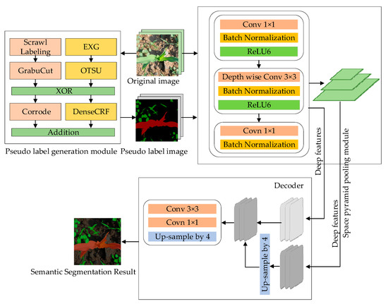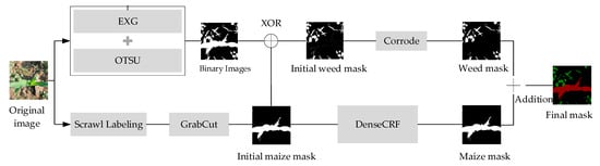 - We propose a pseudo label generation module, which generates bipartite maps of maize and weeds by using Exceed green feature Graying (EXG) and Otsu, generates maize masks by the GrabCut method, and obtains the mask images of maize and weeds, respectively, by using the dissimilar-or operation, and then refines the generated pseudo labels by the erosion and DenseCRF methods to reduce the annotation cost.