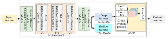 The Atrous Spatial Pyramid Pooling (ASPP) module is in the next layer of the encoder backbone extraction network shown in Figure 5 and consists of three parts: (1) the convolution layer consists of a 1 × 1 convolution and three 3 × 3 dilated convolution, and the three empty space convolutions with parallel expansion rates of 6, 12, and 18, respectively, are used to perform convolution operations on the 256 channels, to expand the receptive field to obtain the corresponding global information and the four convolution operations. A total of four feature maps are obtained, and each convolution operation is followed by a BN layer for normalization; (2) a global average pooling is performed on the features to obtain image-level features, which are convolved point-by-point and then recovered to the original size using bilinear interpolation; and (3) the four feature map channels obtained above are connected and fused by 1 × 1 convolution to obtain a new feature map with 256 channels. The ASPP module convolves the high semantic feature map output from the MobileNet-V2 network with different expansion rates to obtain multiscale features and obtains the deep feature maps with significant semantic information as the output feature maps of the encoder part of the model in this paper, which reduces the time needed by model to learn the data and improves the segmentation accuracy by utilizing the BN layer after each convolutional layer.