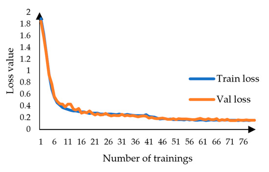 The migration learning method [28] is used in training. Firstly, the network is frozen to train using pretraining weights using the generality of multiple classification features, fine-tuning the parameters, and the feature network does not change; then, the network is unfrozen, the whole model is trained, and the feature network is changed to minimize the loss convergence. The specific training parameters are shown in Table 1. The model uses the Adam optimizer and adopts the cosine annealing learning rate decay method to obtain the learning rate, and the upper limit of the whole training cycle is 80. Due to the increase in computational volume after unfreezing the network, to reduce the computational pressure, the number of image batches was set to two images/time.