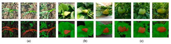 Visualization of SL-Net model segmentation results: (a) maize and weed images; (b) immature strawberry and leaf images; (c) immature tomato and leaf images.