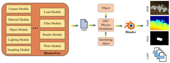 In this paper, the M-ST instance segmentation network serves as a target detection and segmentation network based on synthetic data. However, the high-quality PBR method is an important step in the processing stage of synthetic data. It plays a key role in improving target detection accuracy and reducing the domain gap between synthetic and real data [36,40]. The initial dataset in this paper comprises reduced versions from BOP [41] including LineMOD and T-LESS datasets (specific characteristics of these datasets in question are described in Section 4). These datasets were generated by BlenderProc. BlenderProc is a modular program pipeline based on Blender, enabling the synthesis of training images with high visual realism and the customization of a variety of annotation information, such as mask, depth, and 6-DoF pose, catering to a wide range of computer vision tasks. BlenderProc includes several modules such as a camera module, object module, material module, and lighting module, among others, providing flexibility according to the task requirements to write configuration files, and import the 3D model into GPU for physical simulation. The common rendering process of BlenderProc is illustrated in Figure 2.