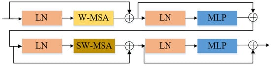 The Swin Transformer layer consists of a normalized layer (LayerNorm), Windows Multi-head Self Attention (W-MSA), Shifted Windows Multi-head Self Attention (SW-MSA), and Multi-Layer Perceptron (MLP), as illustrated in Figure 6.