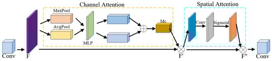 In Equations (3) and (4), represents the feature map, MLP denotes the multilayer perceptron, AvgPool and MaxPool indicate the average pooling and maximum pooling, respectively, represents the channel attention matrix, and, finally, is the output feature of the channel attention module.