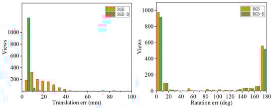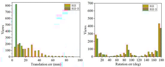 Concerning the histograms of error statistics proposed in Figure 10 and Figure 11, it is evident that both TE and RE are reduced when depth information is incorporated using RGB-D. The reduction in TE is particularly significant. It is evident that refining the pose, based on mask and depth information, has beneficial effects on the error reduction in the pose estimation task.