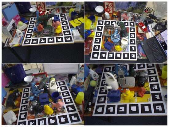 - Hinterstoisser, S.; Lepetit, V.; Ilic, S.; Holzer, S.; Konolige, K.; Bradski, G.; Navab, N. Technical Demonstration on Model Based Training, Detection and Pose Estimation of Texture-Less 3D Objects in Heavily Cluttered Scenes. In Proceedings of the Computer Vision–ECCV 2012, Workshops and Demonstrations, Florence, Italy, 7–13 October 2012; pp. 593–596. [Google Scholar]