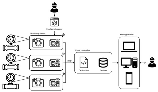 The overall architecture of the IoT platform is illustrated in Figure 1, and this includes the aforementioned monitoring device that needs to be coupled with an analog gauge, which needs to fit different sizes and types of gauges and withstand the adverse environments that are characteristic of a wide range of industries. As the device is installed within a gauge and designed to adapt to various gauge sizes for enhanced flexibility, the operator can access a web-based interface for configuring the device. Through this interface, the operator can define the specific characteristics of the currently utilized gauge and set parameters such as the intervals for capturing images or configuring connection credentials. The monitoring device includes a camera sensor and microcontroller for capturing gauge images and sending them to the cloud. The computer vision algorithm processes these images to read gauge values, which are stored in a database. Users access these data via a web-based interface, allowing for customized data presentation, warnings, and alarms.