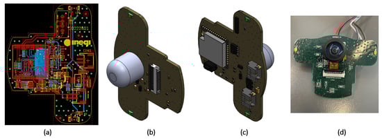 Figure 3. Conception of PCB based on ESP32. (a) PCB routing. (b) Front view of the PCB. (c) Rear view of the PCB. (d) Real image of the PCB.