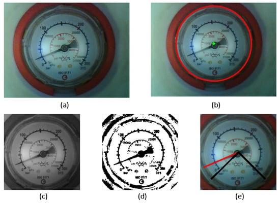 Figure 6. Main steps of the gauge-reading algorithm. (a) Original image. (b) Gauge dial detection. (c) Cropped grayscale image. (d) Binarized image. (e) Gauge pointer detection.