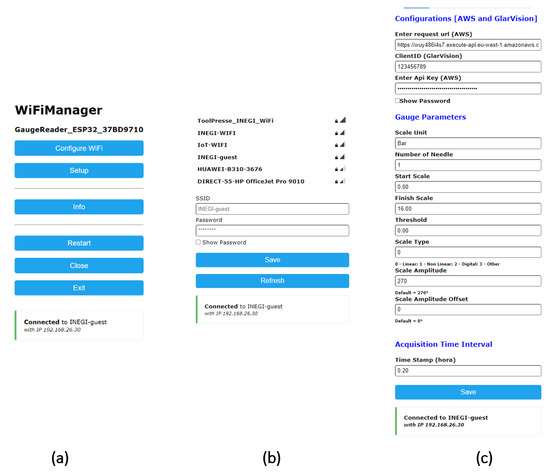 In order to calculate the indicated gauge value, data related to the gauge scale are required, so this information is incorporated into the metadata in each image, to be decoded later when the gauge reading process in the cloud is executed. Since the device monitors just one gauge, we developed a configuration page to define several variables related to the gauge being monitored for each microcontroller, as detailed in Table 1. The configuration web page, as depicted in Figure 7, serves as a user-friendly platform for setting up the microcontroller to read a specific gauge. The user has the capability to configure the Wi-Fi connection, set gauge parameters as previously discussed, input necessary credentials for secure cloud access, and specify the preferred time intervals for image capture. These settings accommodate diverse application needs. Furthermore, the microcontroller’s configuration can be activated by opening the device’s case, facilitated by the inclusion of a limit switch.