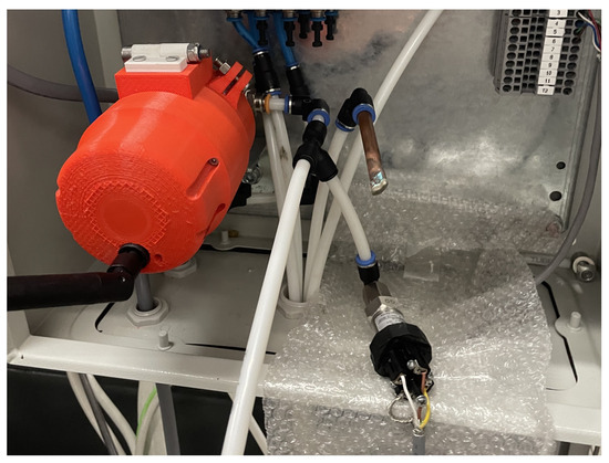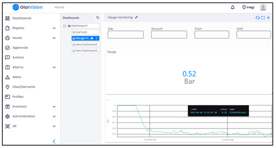 The IoT platform was finally tested at INEGI’s industrial facilities. This process began by installing the monitoring device within a pressure gauge responsible for monitoring the air pressure supplied to a laser cutting machine. The monitoring device was mounted, as shown in Figure 9, with a pressure transducer on the side. The pressure of the feeding line was controlled manually through a pressure valve and it was changed between 2.5 and 7 Bar. Prior to commencing the test, the device was properly configured with the necessary information specific to the selected gauge, to ensure accurate readings.