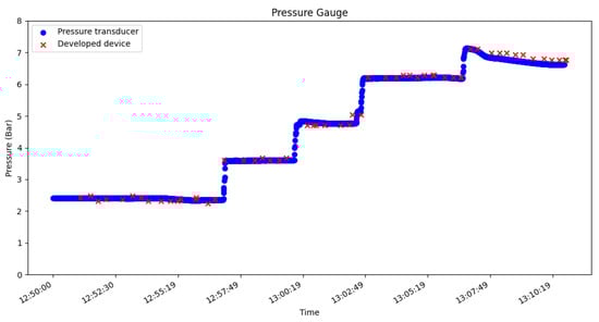 The data was saved including the images captured, and a graph was drawn as shown in Figure 9, which shows the gas pressure during the testing period. The pressure values read by the monitoring device were monitored using a pressure transducer, to corroborate the values obtained by the device. As depicted in Figure 10, the values exhibited slight fluctuations, which can be attributed to the gauge’s vibration and its pointer, in conjunction with the error of the computer vision algorithm. In this test, the maximum absolute error was 0.217 Bar, which corresponds to a relative error of 1.81%.