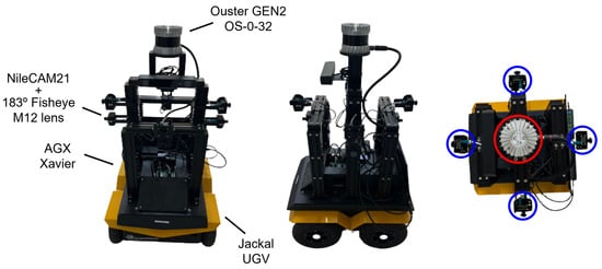 The sensor configuration (left,middle) and top-view image (right) of the mobile robot used for collecting the JBNU-Depth360 dataset. A Jackal UGV equipped with an AGX Xavier. An Ouster GEN2 OS-0-32 is located at the center of the robot to acquire the LiDAR projections of surrounding environments, and four NileCAM21 cameras with a 183° Fisheye M12 lens are equipped in the front, rear, left, and right directions. In the top-view image, LiDAR and camera positions are highlighted in red and blue, respectively.