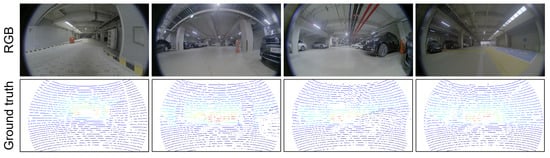 The JBNU-Depth360 dataset was acquired from underground parking lot environments located at Jeonbuk National University, South Korea. The dataset consists of 6 sequences, and we sampled 4221 RGB images for the frontal camera by removing temporally adjacent images that contained similar visual information. LiDAR–camera calibration was conducted in each data-acquisition process to obtain the extrinsic parameters. Ground truth depth maps were produced by projecting 3D LiDAR points onto the image plane of the corresponding RGB images based on the extrinsic parameters. The RGB images and LiDAR projections were stored with a resolution of px. After collecting the dataset, car plate numbers and faces were blurred in the RGB images to anonymize private information. Figure 2 presents examples of the RGB images and their corresponding LiDAR projections.