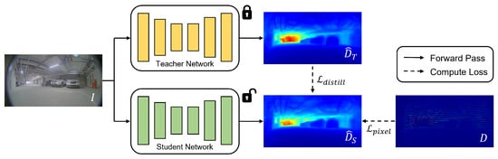 In Figure 3, an RGB image is fed into the student network to infer the depth prediction . The pixel-level loss measures the distance between the predicted depth map and the LiDAR ground truth D, and it is defined as follows.