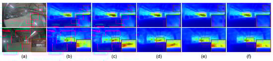 Qualitative results of BTS on the JBNU-Depth360 dataset. (a) indicates input images. (b) is the depth maps without TL and KD. (c) presents the results with a learning rate of . (d) is the depth maps with KD. (e) is the depth maps with TL, and (f) is those with TL and KD. Red boxes highlight the details of the predicted depth maps.