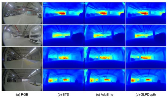 Qualitative results of depth-estimation networks for fisheye images in the KITTI-360 dataset. (a) indicates input images. (b–d) present depth maps inferred by BTS [9], AdaBins [23], and GLPDepth [21], respectively.