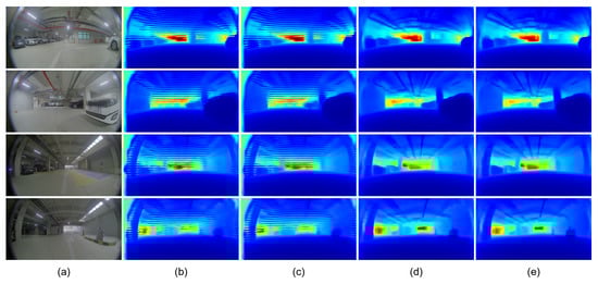 Qualitative results of GLPDepth on the JBNU-Depth360 dataset with the pre-processing of image resize. (a) indicates input images. (b) is the depth maps without TL and KD and (c) is with KD. Without TL, stripe noises were observed in the predicted depth maps. (d) is the depth maps with TL, and (e) is those with TL and KD.