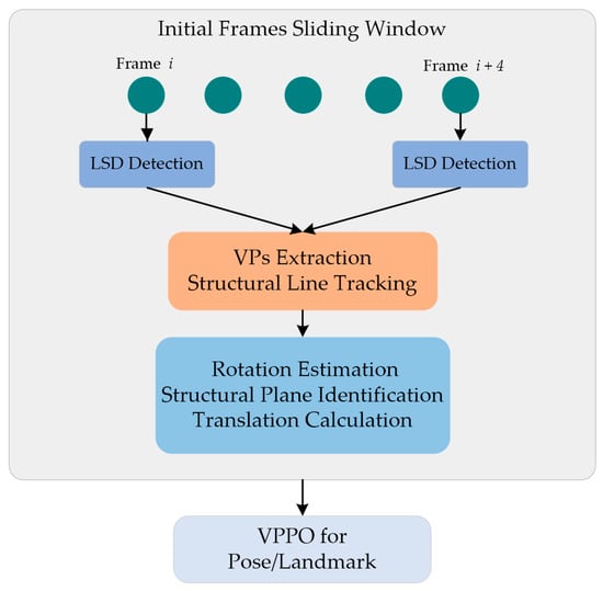 In this section, vanishing point extraction and structural line tracking will first be elaborated as the foundation of the proposed algorithm. Subsequently, the estimation of rotation, identification of structural planes, and calculation of translation will be discussed more specifically. Finally, after optimizing the camera pose with the VPPO optimization strategy, the construction of the initialization map will be accomplished. Non-structural lines filtered out by the vanishing point direction will not participate in tracking or pose computation and optimization, nor are they included in the scope of initialization map reconstruction.