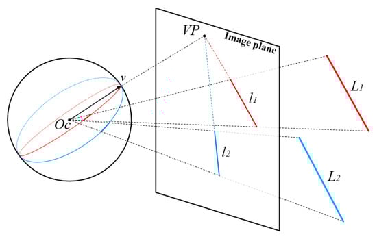 By mapping the lines on the image to a unit Gaussian sphere [37,38], the arcs formed by the parallel lines intersect at a common point. The direction from the sphere center to the intersection point represents the VP direction of the parallel lines. By clustering the intersections, the VPs and parallel lines of the image can be obtained, as shown in Figure 2. We adopted a coarse-to-fine strategy. Initially, we employed Gaussian sphere mapping to extract the VPs approximately and group the lines with the same direction. We then used orthogonal constraints to filter out the VPs and lines in three orthogonal directions. Finally, the RANSAC [39] method was applied to accurately solve the VP coordinates for each line group. We referred to the lines in each VP direction as structural lines, and tracked these structural lines between consecutive frames.