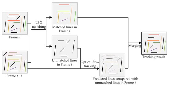 We utilized line matching techniques for the purpose of structural line tracking. While current line detection algorithms demonstrate satisfactory efficiency and stability, there is still potential for improvement in line tracking between frames. Line matching algorithms are frequently employed in SLAM systems [40,41,42], yet they often exhibit suboptimal continuous matching rates due to sensitivity to noise. To tackle this challenge, we propose a modified line feature tracking method based on line binary descriptor (LBD) [43] matching. This method aims to improve match probability by identifying additional matches among the unmatched lines, which should have been matched. Figure 3 demonstrates our approach that combines LBD matching with pixel-based optical flow tracking [44]. To handle unmatched lines, we sampled pixels along these lines and employed optical flow tracking in the subsequent frame. By calculating the pixel and angle distance between the unmatched lines, we could identify new matches. This methodology enabled us to reliably track line features across multiple frames.