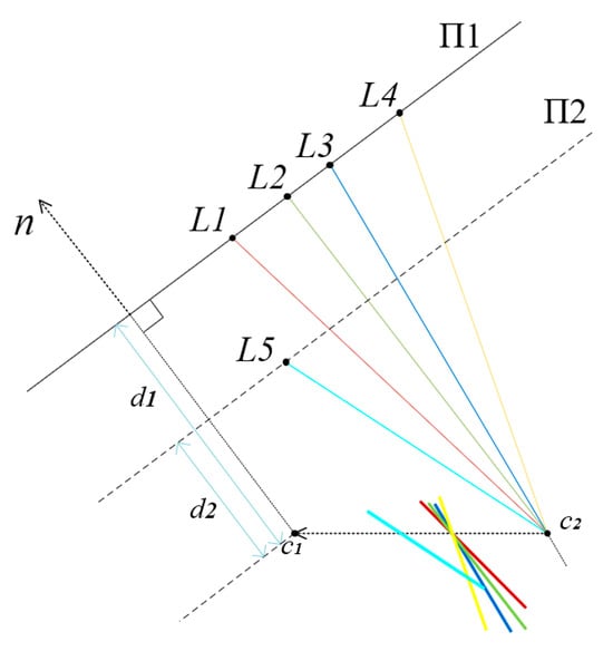 c1 and c2 are the camera centers of two initial frames on the baseline. The 3D lines L1, L2, L3, and L4 (orthogonal to the page) are parallel and coplanar on plane Π1, and their associated planes all intersect at a characteristic line (orthogonal to the page) [46], while L5 lies on another palne, Π2. n is the plane normal; d1 and d2 are the plane distances.