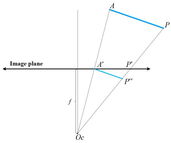 We established the world coordinate system on the structural plane that contained the largest number of coplanar lines. A structural plane typically includes structural lines aligned with two dominant directions, which are defined as the x and y directions of the coordinate system. A structural line was selected from both the x and y directions, respectively, as the x-axis and y-axis, and the intersection of these two lines was taken as the origin of the coordinate system. The z-direction can be obtained by taking the cross product of the x and y directions. Based on stable structural line tracking, we could easily calculate the translation of the initialization frame [45], as shown in Figure 5. A′P′ is projected from AP, P″ the intersection of the line (OcP) with the line L passing through A′ and whose direction is A→P. It is assumed the length of AP is known, based on our experience, set it to be 1000 units in length. Otherwise, tcw will be calculated up to a scale factor α. As OcA′P″ and OcAP are similar triangles, the lengths of OcA′ and OcP′ can be directly calculated from pixel coordinates and camera intrinsic parameters. AP is one of the axes of the world coordinate system, rotating its direction through the Rcw to obtain the direction of A′P″ in the camera coordinate system. Moreover, A′P″ intersects OcP′ at point P″, obtaining the length of A′P″. So, we obtain the translation vector tcw: