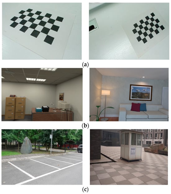Samples of dataset images. (a) The sample images of self-collected chessboard datasets. (b) The sample images of open-source ICL-NUM datasets. (c) The sample images of the self-collected real-world scenes datasets.