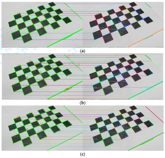 Line tracking: (a) only 7 lines matched with LBD at the rough matching step because the textures are monotonous and repetitive; (b) the number of matches increases up to 20 after enhanced matching; (c) line tracking after a five-frame interval, but still maintaining high-quality matching with 16 matches.