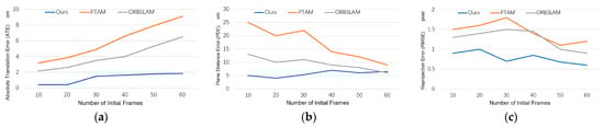 We compared our method with two PnP methods. In Figure 8, it can be seen that our proposed method is superior to the PnP and Plane + PnP algorithms in terms of average ATE, PDE, and RMSE performance after testing all datasets. Especially in ATE, our method effectively avoids the accumulation of translation errors, while other methods continue to accumulate translation errors. In terms of PDE and RMSE, all methods decrease the cumulative errors as the initialization frame increases and more multiple perspectives features are added, but our method still has higher accuracy. PnP is relatively less stable, but, like other methods, more initial frames will bring better results.
