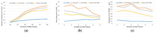 We compared our optimization method, VPPO, with different optimization methods. The multi-frame optimization strategy allows us to fuse as much information from multiple frames as possible, so that the final result has the lowest cumulative error and the highest positioning accuracy. We combined different initial pose algorithms with different optimization strategies and compared them with our proposed method. As shown in Figure 9, VPPO presents a huge accuracy advantage. It achieves significantly better pose accuracy than BA and PBA from the very beginning frames and performs the best among all methods when using more than 30 frames. Our method is also fast and accurate in estimating plane positions, which also results in a relatively minimal RMSE.