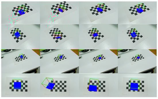 Figure 10 demonstrates the qualitative results of all tested methods using the chessboard datasets. Our work, VPPO, shown in the first column, obtained the best results: the blue bottom lies exactly on the plane, and its orientation is exactly aligned with the chessboard. The second column, PnP + BA, yields the worst performance because there is no plane constraint involved. Although PnP + PBA in the third column uses coplanar landmarks during optimization, its results are still inferior to Plane + PnP + PBA in the fourth column due to the error of triangulation.