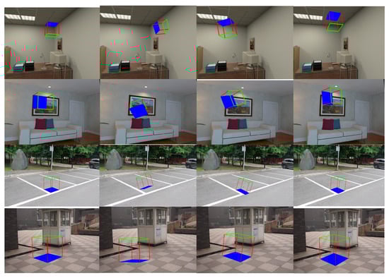 Initial pose visualization in real scene images. From left to right are results of VPPO, PnP + BA, PnP + PBA, and Plane + PnP + PBA.
