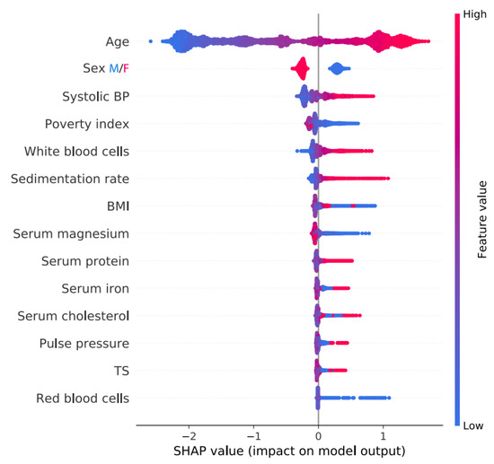 One of the possible representations of SHAP values is the SHAP summary plot, in which features are ranked first by their global impact and then by points representing the SHAP values. Points that represent each feature of each sample in the graph are created—in blue, they represent low values of the contribution of the feature, and points colored in red represent high values, and there may be a color graduation between the points—which accumulate vertically, indicating the density [33]. Figure 1 shows this type of graph, in which the influence of certain attributes on mortality is observed. Thus, high SHAP values indicate, for a given attribute, a greater probability of death [33,34].