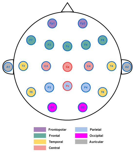 Figure 3 illustrates the international 10-20 electrode positioning system [67], with annotations to facilitate comparison with the patient data from the UBMC database. In the figure, the electrodes corresponding to regions affected by epilepsy in the patients documented in [66] are highlighted in blue. The channels that were not recorded, Cz and Pz, are indicated in red.