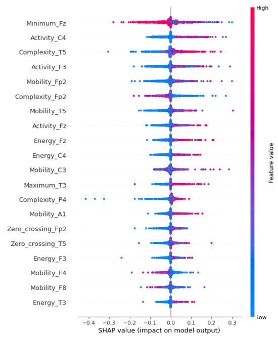 Among the XAI approaches, the SHapley Additive exPlanations (SHAP) method, as presented in [26], provides significance values for each feature in predicting the data, as discussed in [24]. According to [27], where the author conducted a study to identify epileptic seizures through the analysis of EEG signals using the SHAP technique, interpreting the model’s output allows us to understand where it needs improvement. They mentioned three benefits of SHAP: global interpretability (contribution of each feature), local interpretability (each individual sample has its SHAP value), and versatility (usable with any tree-based model) [27].