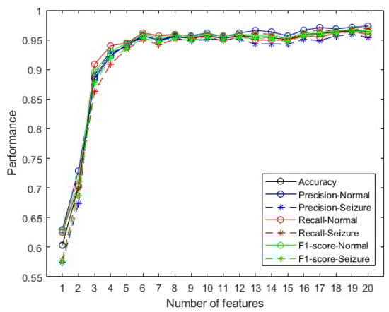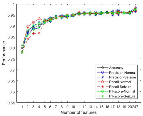 Feature extraction was performed using a window of 1 s (500 samples per second); thus, the number of entries was reduced to 7011 samples of training data (3479 samples of interictal data and 3532 samples of all classes of ictal data) and 779 test data samples (416 interictal data samples and 363 samples from all types of ictal data).