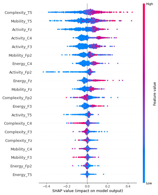 The 4 features and the 5 most recurrent channels presented in the first 20 attributes listed by SHAP in the previous phase were selected. This refined subset, encompassing 20 new attributes (5 channels × 4 features), was employed to train a new model. Subsequently, the SHAP analysis was reapplied to this model to rank the attributes according to their contribution to the predictive accuracy.