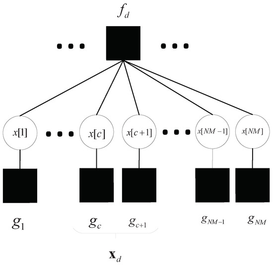 The representation encapsulated in Equation (31) can be interpreted via a factor graph, as illustrated in Figure 3. This schematic elucidation provides a sophisticated methodology for ascertaining the marginal distribution, capitalizing on the fact that the variables are independent conditionally. Within this graph, each rectangular node, termed a function node (FN), denotes a specific function, such as , where . On the flip side, every circular node, emblematic of a variable node (VN), aligns with a unique variable. Given the inherent sparsity of the EC matrix , the interconnections between variables and FCs remain notably finite.