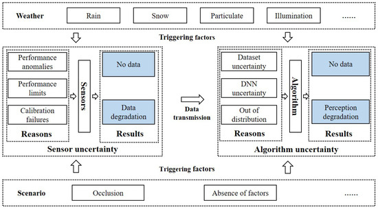 Autonomous driving (AD) holds immense significance in enhancing the safety and efficiency of road traffic [1]. Perception serves as a crucial means of obtaining environmental information, acting as a vital information source for the real-time operation of AD systems. The accuracy and completeness of perception results play a pivotal role in directly influencing the functional implementation of downstream modules, thereby impacting the safety of AD’s real-time operations. Figure 1 illustrates typical AD accidents caused by perception uncertainty in recent years, highlighting perception uncertainty as a significant factor contributing to accident risk. Perception uncertainty scenarios are commonplace due to internal and external factors that influence the perception system. These scenarios encompass various aspects, such as functional safety (FS) and the safety of the intended functionality (SOTIF). The presence of perception uncertainty directly affects the engineering practices of AD and represents a key issue that must be addressed in commercial operation [2,3]. Despite the considerable progress in enhancing perception performance in recent years, research on perception uncertainty and its associated risks has not garnered sufficient attention, and effective solutions remain a critical area in need of further exploration.