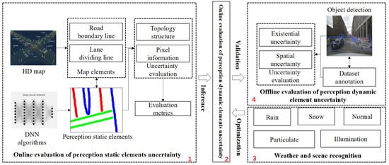The core of the online assessment of overall perception uncertainty is to use the uncertainty of static elements in perception to infer the uncertainty of dynamic perception elements. The online assessment of uncertainty in static elements in perception based on HD maps is fundamental, and its accuracy and completeness directly impact the effectiveness of the overall uncertainty assessment. By considering scene and weather factors, we can optimize the assessment method and greatly improve its accuracy in dealing with dynamic and static uncertainty. To further validate the effectiveness of the assessment method, it is necessary to obtain uncertainty information about dynamic perception elements. Therefore, a model for the offline uncertainty assessment based on dataset annotations was constructed. The logical architecture of the entire method is illustrated in Figure 3.