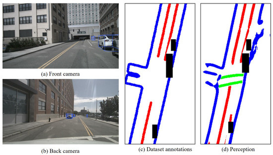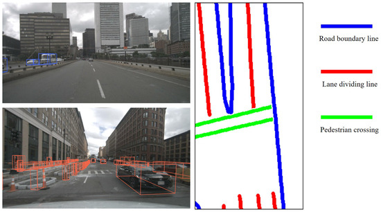 where denotes static environmental elements, while represents dynamic environmental elements. and denote road boundary lines and lane dividing lines within static feature elements. Moreover, and represent the existential and spatial information of perception results. The nuScenes dataset includes HD map data and annotated perception results, encompassing both static and dynamic elements of the environment [32]. The annotations of dynamic elements and the HD map serve as prior information for evaluating the perception output of AD and quantifying the uncertainty of the output results. This paper uses the nuScenes dataset as an example to showcase the presentation of selected environmental feature elements. Figure 4 illustrates the representation of dynamic and static elements in environmental perception.