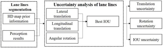Considering the slight global offset and rotation in the detection of lane lines and prior information, which results in a low accuracy of lane line matching, this paper adopts a local approach to consider lateral translation, longitudinal translation, and local rotation to find the best matching IOU, representing the detection effect in a local range. The translation and rotation values under the maximum IOU can serve as indicators of uncertainty in lane line detection. The relevant detection process is illustrated in Figure 6, and the specific implementation is illustrated in Algorithm 1.