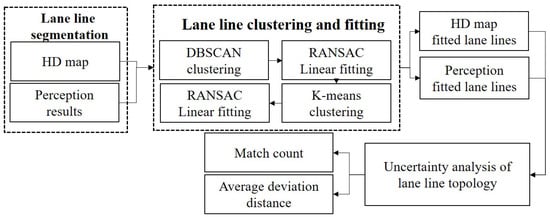 The flowchart for the uncertainty assessment based on the lane line topological structure is shown in Figure 7. This study was based on the nuScenes dataset, so post-processing was applied to the map lane line prior information and the perception lane lines from semantic segmentation in the images. Since the lane lines exhibited a linear distribution, the initial clustering was performed using the DBSCAN (density-based spatial clustering of applications with noise) clustering algorithm [33,34].